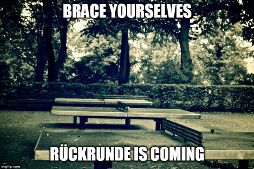 Die Vorrunde ist vorbei, die eigenen – hoch gesteckten – Ziele wurden in der Regel wie immer nicht erreicht. Zusätzlich zum ganzen Stress mit den Weihnachtsgeschenken gilt es jetzt auch noch sich im Verein auf eine Rangliste für die Rückrunde zu einigen. Der Dezember ist hart für jeden Tischtennisspieler. Zum Glück ist erstmal Weihnachtspause.